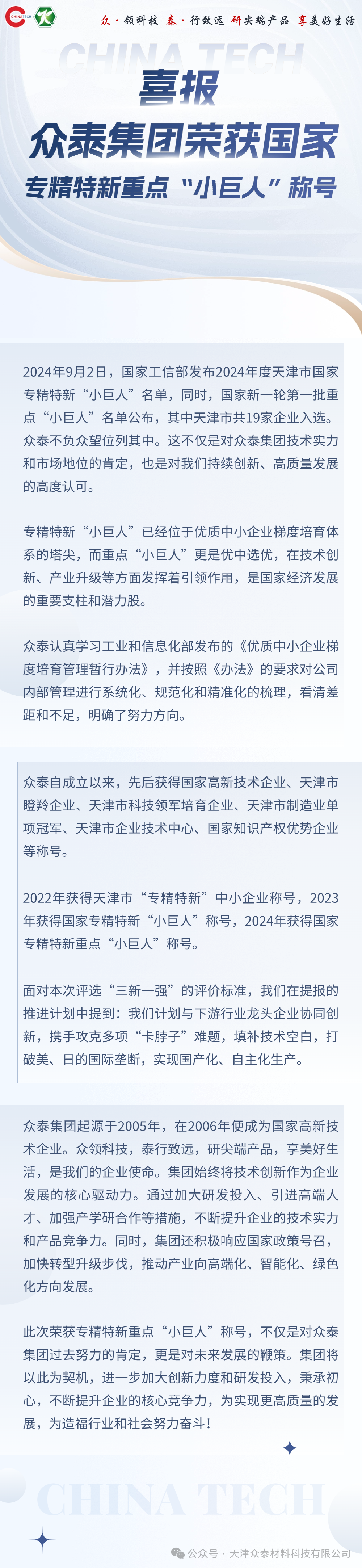 2024年9月2日,國家工信部發(fā)布2024年度天津市國家專(zhuān)精特新“小巨人”名單,同時(shí),國家新一輪第一批重點(diǎn)“小巨人”名單公布,其中天津市共19家企業(yè)入選。眾泰不負眾望位列其中。這不僅是對眾泰集團技術(shù)實(shí)力和市場(chǎng)地位的肯定,也是對我們持續創(chuàng )新、高質(zhì)量發(fā)展的高度認可。